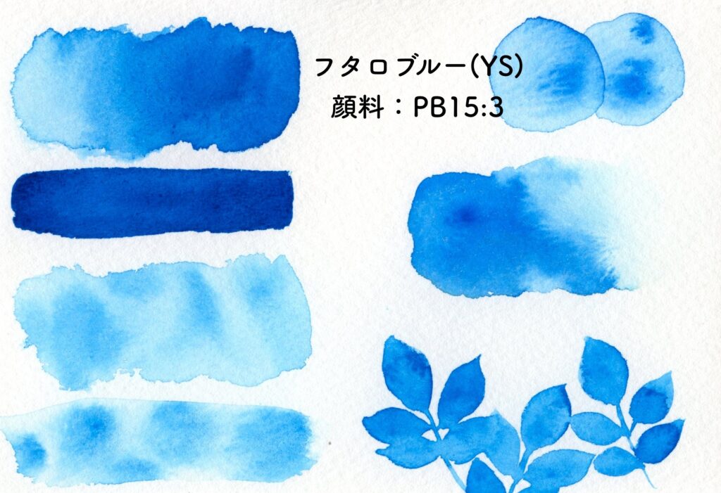 鮮やかな青。基本色の一つで、色名こそメーカーによって違うものの似たような色は必ず毎年パレットに入れています。中身はフタロブルー顔料。フタロブルー(イエローシェード)という名前で売っていることが多いです。