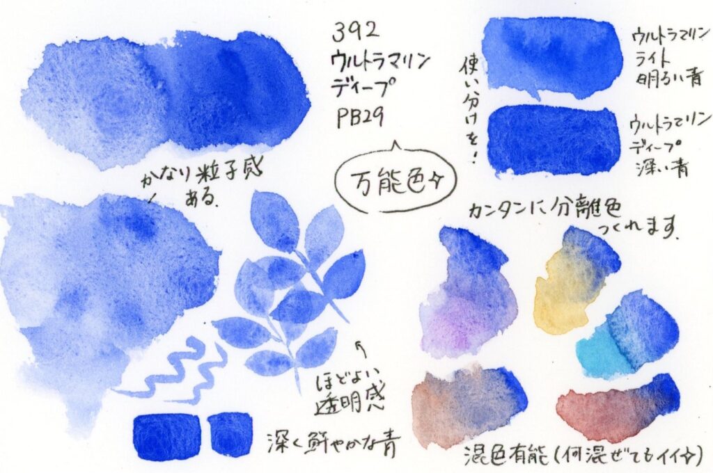基本色の一つですが、マイメリブルーのウルトラマリンディープの色や質感がとても気に入っているので、続投です。粒子が粗いウルトラマリンなので、クセは強いのですが、この粒子感が効果的なことが多いです。色はとっても鮮やかで、ほどよい透明感があります。滑らかなウルトラマリンが好きならまっち、ターナーがおすすめです。