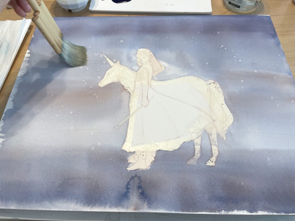 こちらは2023年にリキテックスリキッドで描きました。全ての工程をアクリル絵具で塗っています。薄塗りしているので、かなり水彩の見た目に肉薄していると思います。乾くのが早いので、背景を塗るのが難しかったです。