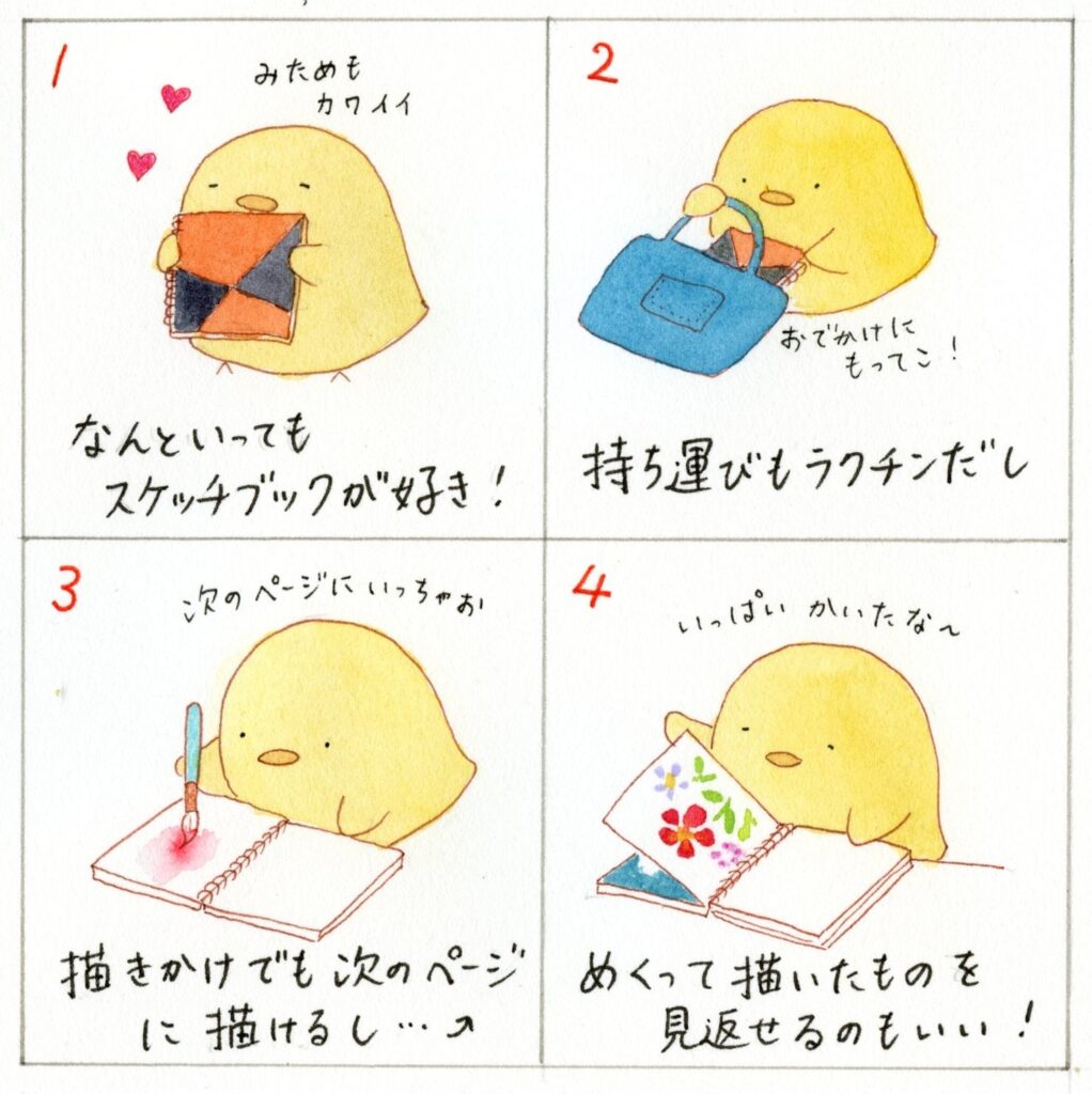 ただ、描き終えるごとに、切り離して額装したい場合は、ブックタイプはちょっと使いにくいこともあります。なので、作品を展示に出す作家さんにはあまり向かないかも。
