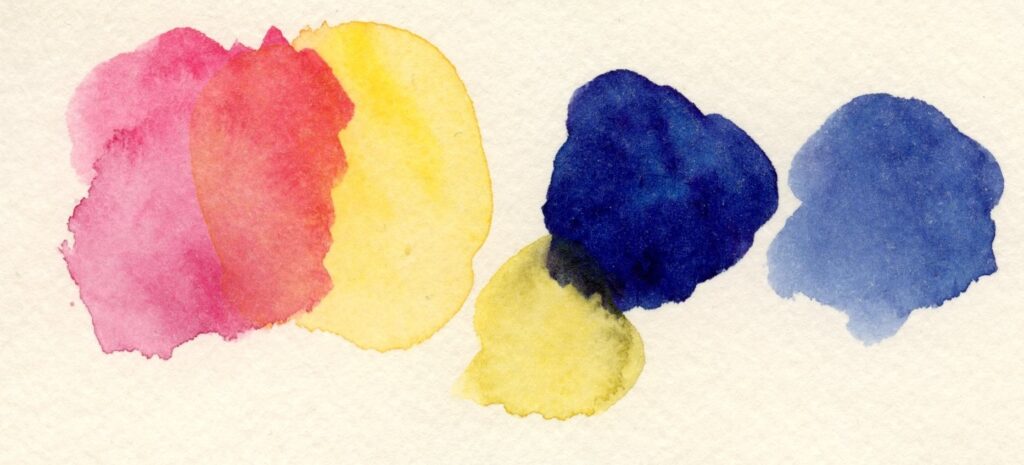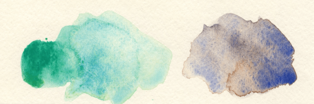 ただ、濃い色に関しては、紙を絵具を吸い込みきれていないので、重ねると色が崩れます(画像右)淡彩同士ならなんとか重ねられる。