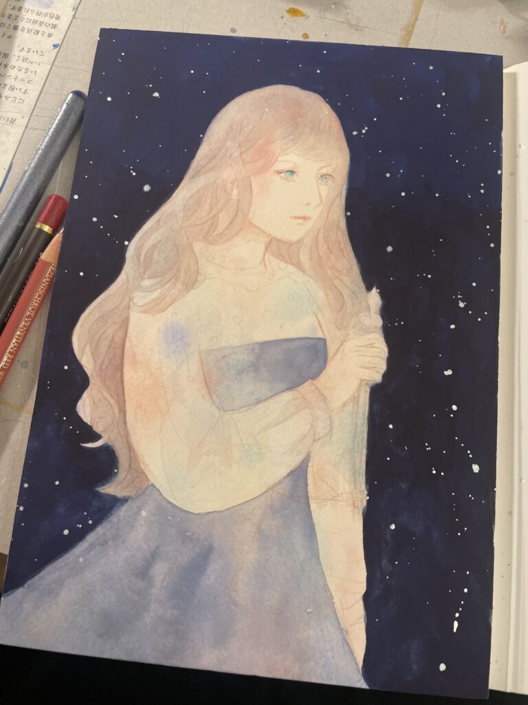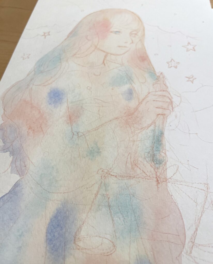 その分、リフティングはばっちりできるので、一度塗った部分の色を取って、発光表現などこの水彩紙ならではの表現もあると感じました!