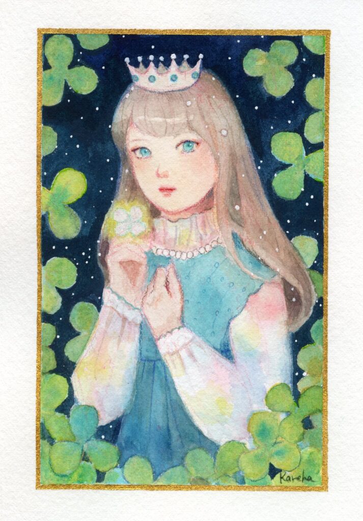 ↓キラキラドローイング。葉っぱと洋服をコバルトターコイズで。こちらもウルトラマリンとの混色で。