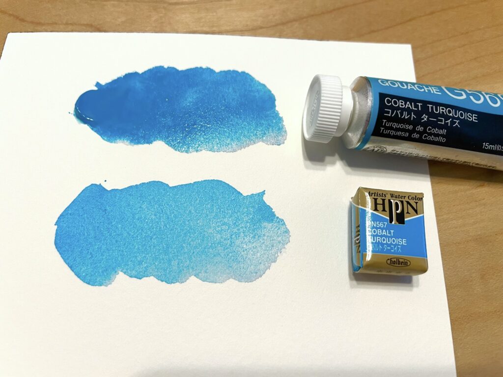 個人的な推しはホルベインアーティストパンカラーのコバルトターコイズです。今まで使っていて一番ストレスがなかったですし、顔料のよさが一番表れている絵具だと感じました。次がマイメリブルー、シュミンケホラダムのコバルトターコイズですね。