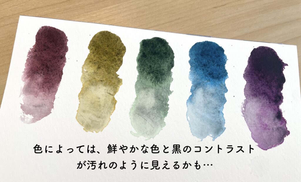 塗ってみた時の色の出方がとても面白いです。一般的には鮮やかな色と黒を混ぜると、暗い色になります。こんな感じで彩度も下がるし、同時に明度も下がります。渋くなって暗くもなるという感じ。インディゴという色があるのですが、これは青と黒が混ぜられた色なのでそれをイメージすると分かりやすいかもしれません。