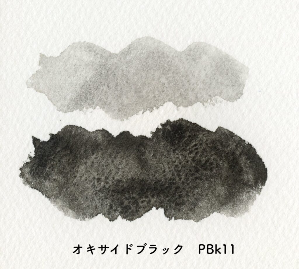 のタイプです。そして粒子の荒い絵具が統一されていて、オキサイドブラックPBk11という色です。このオキサイドブラック(マルスブラックという名前でも知られている)絶妙にクセの強い黒絵具で、こちらの黒の顔料の中身は酸化鉄の黒です。