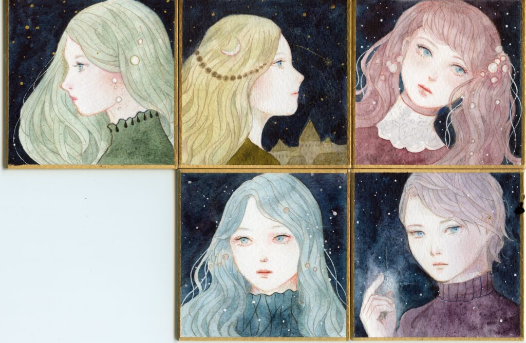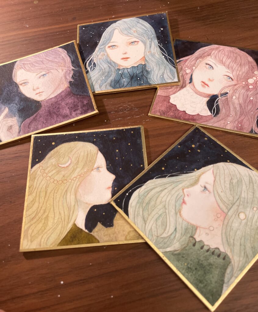 この5色を1色ずつ使って豆色紙を描いてみました!本当は大きい紙の方が、分離を生かせそうな感じがしたのですが、豆色紙の方が統一感出るかなと思いまして…