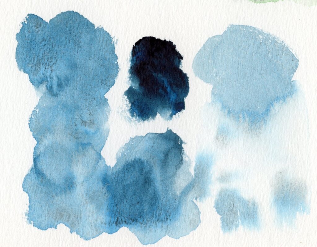 たとえばナイトフォールブルー。濃く塗ったときは分離しないので暗いインディゴカラー(渋くて暗い色)ほとんど黒に見えます。そこに水を加えて伸ばしていくと黒と鮮やかな水色が分離していき、青と黒が両方見えます。