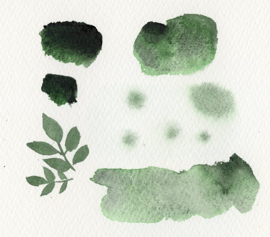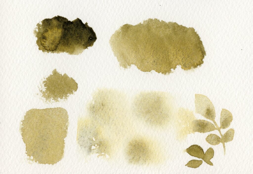 わりと紙によって色の出かたが違う色。深緑っぽく発色することもあれば、しっかり黄緑が分離して宇治抹茶のような感じになることも。葉っぱや木の影のような感じにもつかえるし、分離させないでペリレングリーンのような緑の暗色として使ってもよさそう。