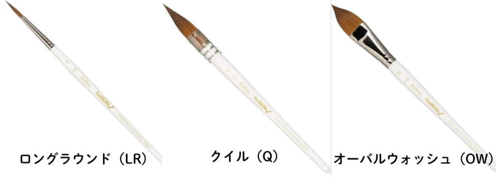 オーバルウォッシュはいわゆるキャッツタンと呼ばれる形で、先が細い平筆です。これは丸筆の先が細いものと平筆の機能を兼ね備える筆です。