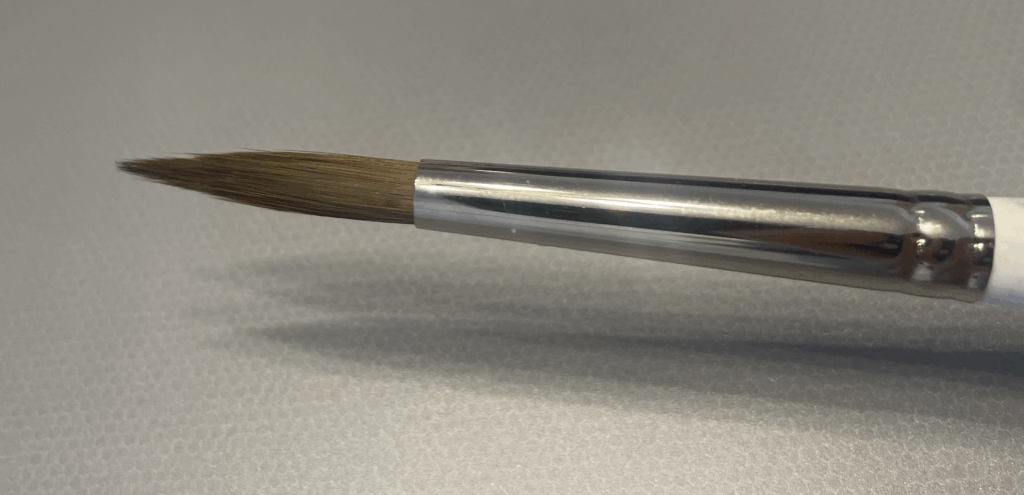 先端が尖っているので、細かい部分を塗ったり、入り抜きがスムーズにできます。なので、細部表現向き。8号でも細い線が描けたりします。逆に面積が大きい部分を塗り伸ばしたり、大きくぼかしをいれたり、ドライブラシは全然できない。線塗りに特化した筆ですね。