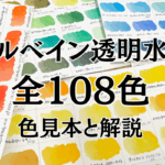 ホルベインの透明水彩は全108色。どんな色があるか知りたい方は、ホルベイン全色レビューをぜひ読んでみてください。このブログでも特にアクセスの多い記事です↓